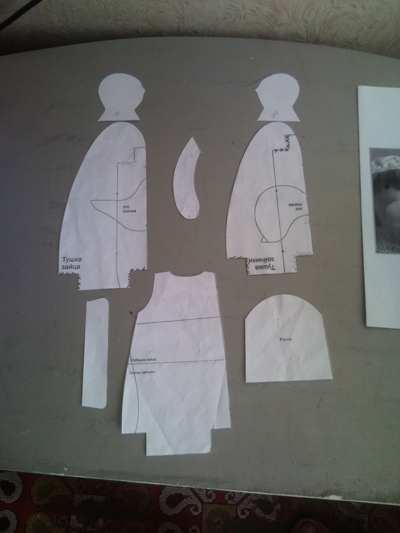 Подборка выкроек полюбившихся мне Тильд хранится в папке. Достаю нужную выкройку и распределяю детали выкройки на кусочках ткани. Для неразлучников тушку шью из наперника, во-первых он плотный и можно набивать потуже, во-вторых тушка будет полностью скрыта одеждой :